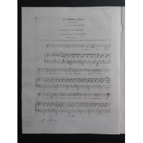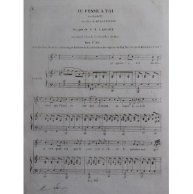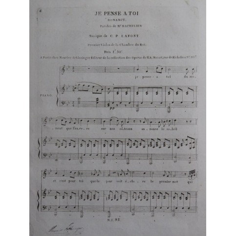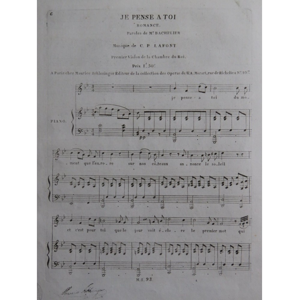 Je pense à toiRomancePour Chant et PianoParoles de Mr BacheierMusique de Charles Philippe LAFONT Paris, chez Maurice Schlesinger Editeur, M. S. 93ca18252 pages33.1 x 26 cmTrès bon état057789