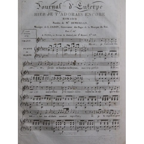JADIN Louis Hier je t'adorais encore Chant Piano ou Harpe ca1820