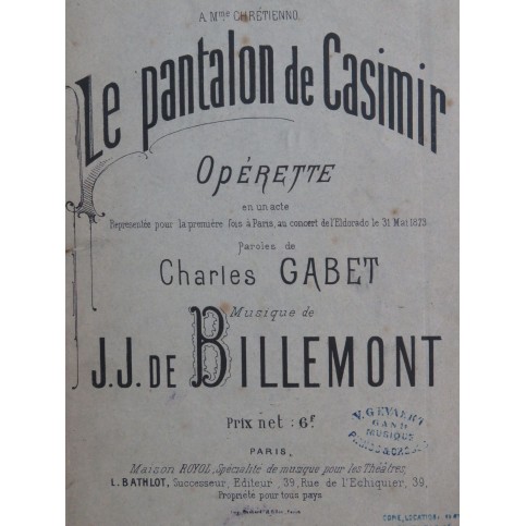 DE BILLEMONT J. J. Le Pantalon de Casimir Opérette Chant Piano 1873