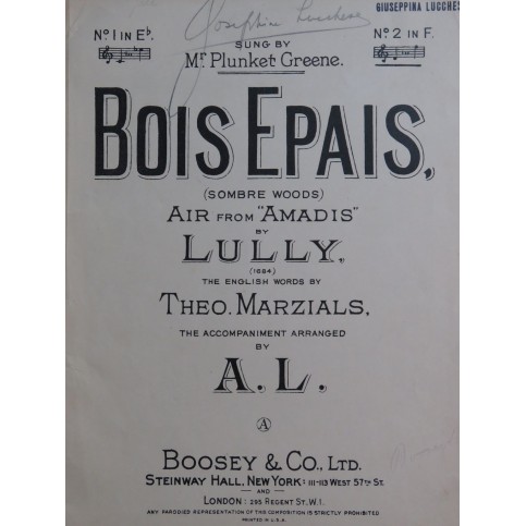LULLY Jean-Baptiste Bois Epais Chant Piano ca1926