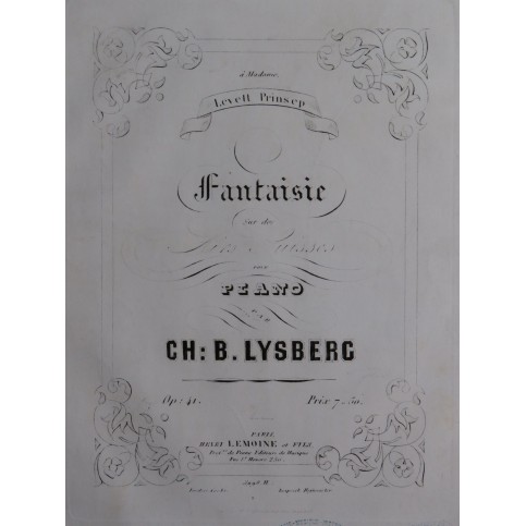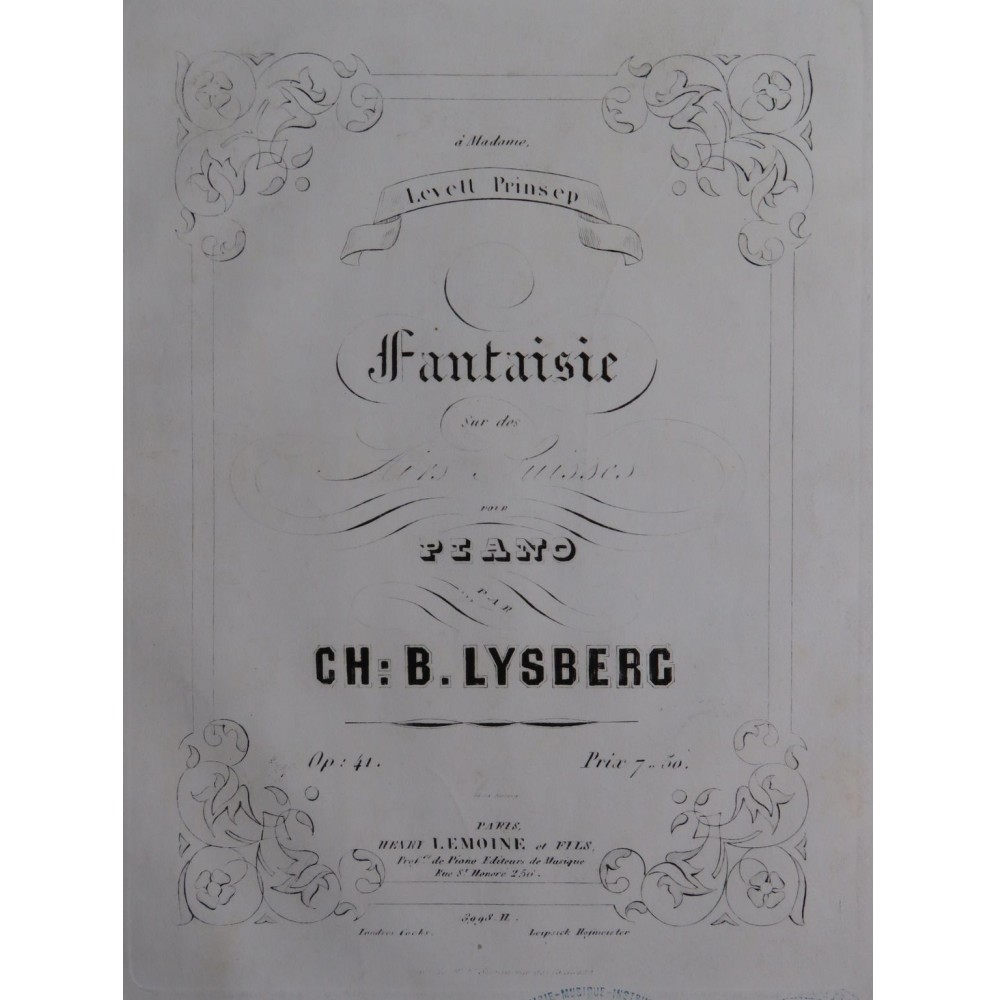 Fantaisie sur des Airs Suissespour Pianopar Ch. B. Lysberg op 41A Madame Levett PrinsepParis, chez Henry Lemoine et Fils Editeurs 3998. HLXIXe siècle 185411 pages32.8 x 25.8 cmTrès bon état058276